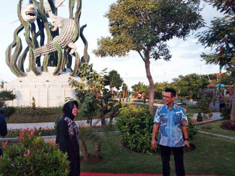 JATIMPOS.CO/SURABAYA - Pemkot Surabaya membangun icon baru untuk Kota Pahlawan berupa Patung Suro dan Boyo di pantai Bulak, Kenjeran. Secara simbolis, patung ini diresmikan oleh Wali Kota Surabaya Tri Rismaharini sebagai kado istimewa di Hari Jadi Kota Surabaya (HJKS) ke-726.