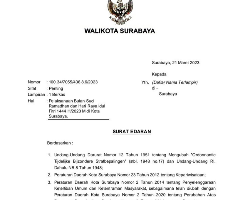 JATIMPOS.CO/SURABAYA - Pemerintah Kota (Pemkot) Surabaya menerbitkan Surat Edaran (SE) nomor 100.34/7055/ 436.8.6/2023 tentang Pelaksanaan kegiatan Bulan Suci Ramadan dan Hari Raya Idul Fitri 1444 H/2023 M. Surat edaran yang ditandatangani Wali Kota Surabaya Eri Cahyadi tersebut, dibagikan kepada lurah, camat, Ketua RT/RW, pengurus masjid/musala, lembaga sosial/keagamaan hingga pengelola usaha di Kota Surabaya.