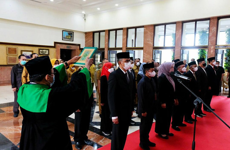 JATIMPOS.CO/ SURABAYA - Wali Kota Surabaya Eri Cahyadi melakukan perputaran jabatan atau rotasi kepada pejabat pimpinan tinggi pratama, administrator, dan pengawas di lingkungan Pemerintah Kota (Pemkot) Surabaya. Karenanya, sebanyak 35 pejabat pemkot dirotasi dan dilantik oleh Wali Kota Eri Cahyadi di Lobi Lantai 2 Balai Kota Surabaya, Selasa (7/2/2023).